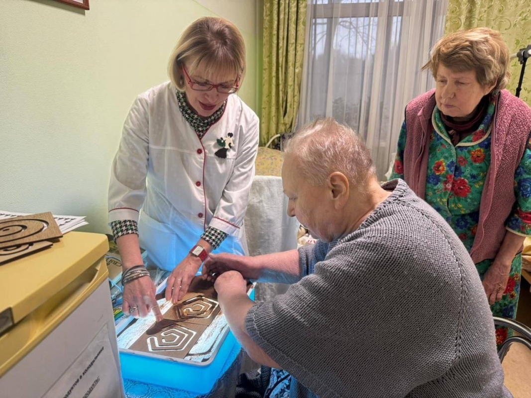 Песочная терапия или рисование на песке с помощью лекал — направление, которое мы активно используем в реабилитации для проживающих Геронтологического центра "Восточный". Цель занятий - восстановление мелкой моторики, речи и эмоционального состояния у людей, которые перенесли инсульт. Занятия проводятся индивидуально, с учетом особенностей перенесенного заболевания. Прикосновение к песку настраивает на отдых и расслабление. А процесс зажатия его в кулак и точное нанесение на рисунок лекала, дает возможность проработать мелкие моторные движения, вспомнить утраченный образ предмета, улучшить внимание и речь. "Сигналы, поступающие в мозг при касании пальцами песка, стимулируют работу нервной системы", - комментирует свою работу специалист по реабилитации Ирина Глухова. "Рисование по лекалам в песке для меня — это не просто творчество, а путь к началу восстановления утраченных функций руки", - говорит проживающая Анна Головина. Песочная реабилитация — интересный, творческий процесс, который вдохновляет и настраивает на восстановление утраченных возможностей.
